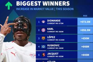 本赛季身价涨幅TOP10:迪奥曼德、卡尔前2,费尔明翻倍到1亿