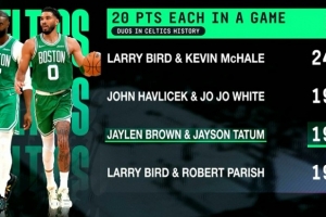 这是双探花第194场同砍20+,队史第三,距离第二的哈弗里切克和乔乔·怀特组合只差2场,队史第一的是伯德和麦克海尔的249场。