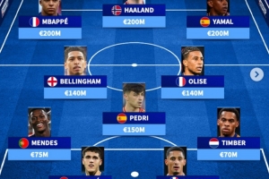 体育资讯4月2日讯 在世界杯即将来临之际,德国转会市场盘点了欧洲最贵阵,姆巴佩、哈兰德、亚马尔三叉戟,佩德里、奥利塞在列。