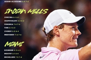 体育资讯3月30日讯 数据显示,辛纳不失一盘,连续夺得3座大师赛冠军。