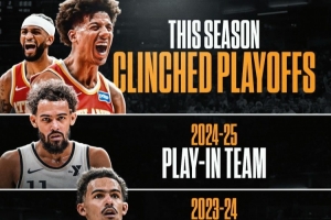 老鹰战绩46胜35负,排名东部第五、正式锁定季后赛(东部前六)和东南区冠军。