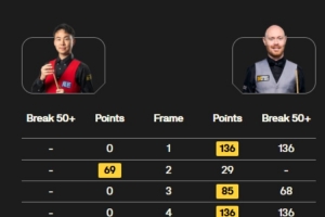 加里·威尔逊手感火热,轰出136、136、68、80、81、55、56分,徐思则打出单杆114分破百,目前威尔逊7-2领先徐思结束第一阶段。