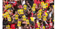 体育资讯04月25日讯 英超第34轮,利物浦vs水晶宫,比赛第13分钟,利物浦主场球迷集体举起黄牌,抗议芬威未来三个赛季提高票价的决定。
